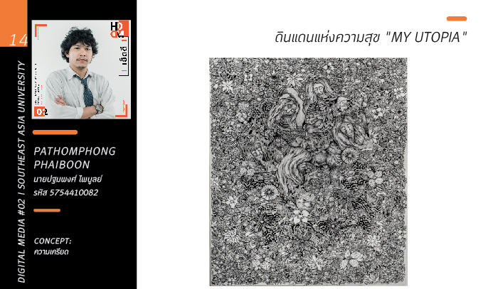 ภาพจิตรกรรม 2 มิติโดยนำทัศนธาตุและองค์ประกอบทางศิลปะ ผ่านลายเส้น โดยใช้ปากกาเคมี ขนาด 70x90 โดยนำเสนอเรื่องราวสะท้อนสังคมเมืองที่แสวงหาความสุข เพื่อหลุดพ้นจากความเครียด