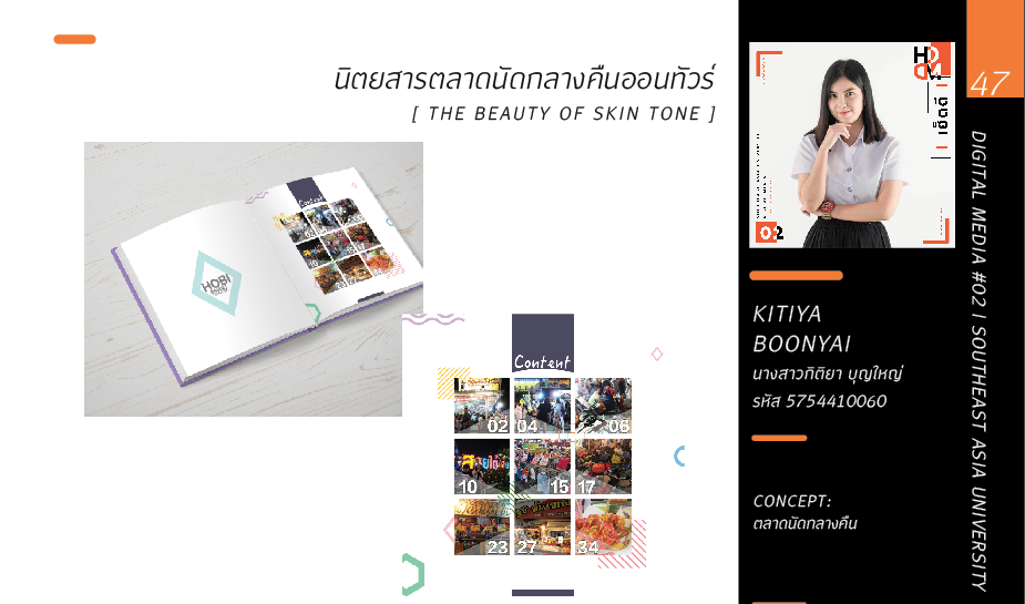 รีวิวตลาดนัดกลางคืนในแต่ละที่และอัพเดทแฟชั่นใหม่ๆ นำเสนอแฟชั่นใหม่ๆหรือที่น่าสนใจในสถานที่นั้นๆ นำมาจัดวางเป็นรูปแบบนิตยสารในแบบของตนเองลงใน Adobe InDesign