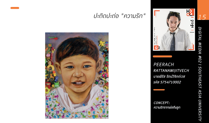 ความรักจากพ่อถึงลูก นำเสนองานโดยใช้รูปแบบสื่อผสมและใช้เทคนิค Collage ในชิ้นงานเพื่อท้อนความรักจากพ่อไปสู่ลูกผ่านชิ้นงานบนเฟรมผ้าใบด้วยการนำวัสดุต่างๆเช่น เศษผ้า ของเล่น มาใช้สร้างสรรค์ในผลงาน